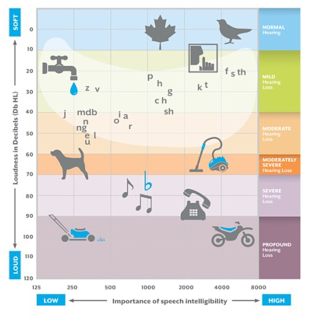 - The vertical portion of the audiogram, labelled Intensity (dB HL) measures how loud in decibels (dB HL) each frequency needs to be for you to hear it 50% of the time, ranging from -10 to 110 dB HL. Did you know -10 dB HL is not silence or the absence of sound? If you were born with normal hearing, it is likely you began with thresholds at or below 0 dB HL. High-decibel sounds could include a chainsaw or siren. Low-decibel sounds could include a whisper or light rainfall.